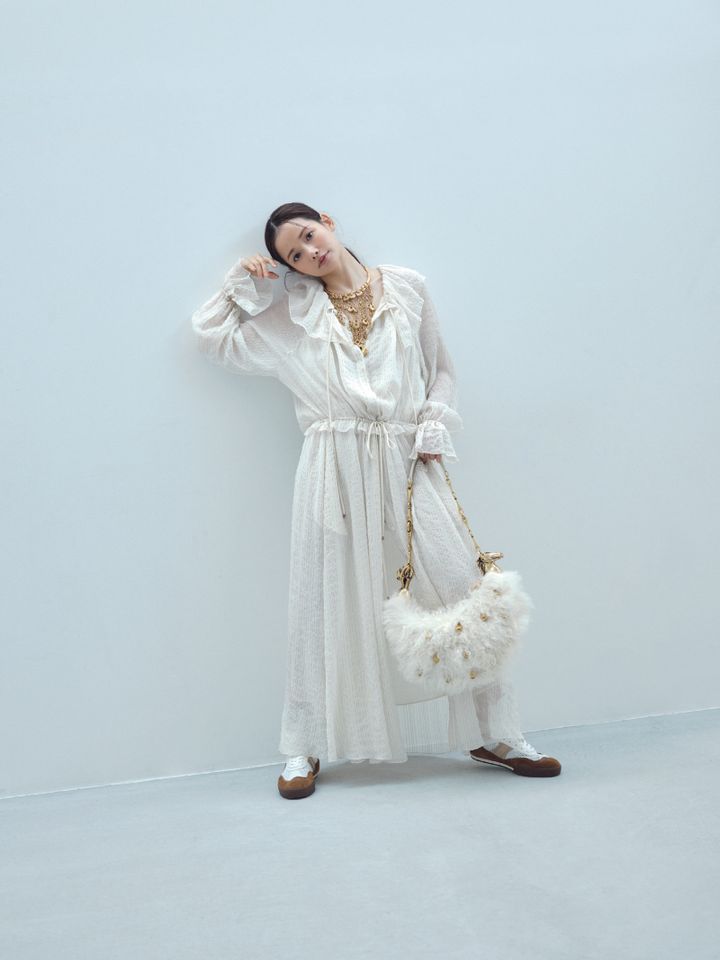 軽やかな素材をギャザー使いでゆるりと仕立てたドレス。ゴールドのホースがユニークなシアリングバッグや、バレエとボクシングからインスピレーションを得た新シグネチャーシューズ「クロエ キック」、揺れるチェーンが大胆なネックレスでプレイフルに彩って。