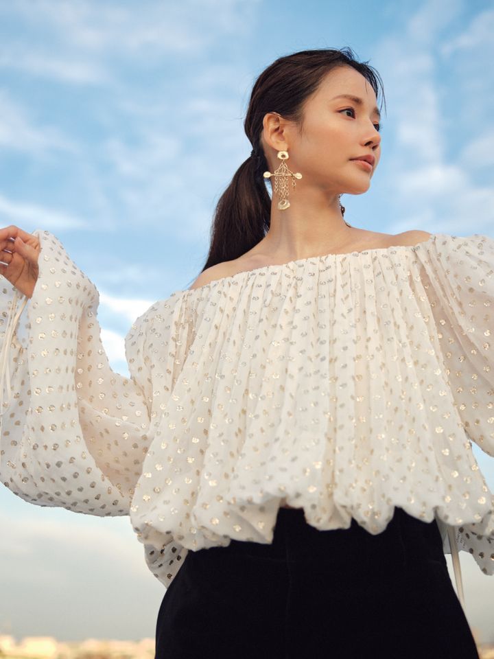 ほんのり光沢感のあるシルク素材のセンシュアルなオフショルブラウス。金のラメ糸を使ったドットジャカード、ボリューミーな袖やバルーン裾がロマンティックなムード。大胆な装飾のヴィンテージライクなピアスで温かみのある華やかさを添えて。