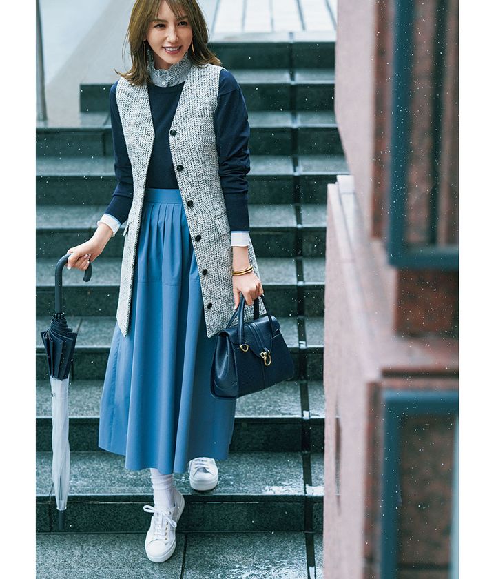 スカート[撥水]¥8,990(アンフィーロ)ジレ¥49,500(Theory)ニット¥31,900(ブランベール/ウールン商会)シャツ¥25,300(ウィム ガゼット/ウィム ガゼット 玉川髙島屋S・C店)バッグ¥55,000(トフ&ロードストーン/T&L)レインスニーカー¥25,300(ペリーコ × スペルガ/アマン)ソックス¥3,630(パンセレラ/ビームス ハウス 丸の内)カサ¥9,900(ハンター/ハンタージャパン カスタマーサービス)ピアス¥34,980 2連バングル¥50,380(ともにソコ/ZUTTOHOLIC)