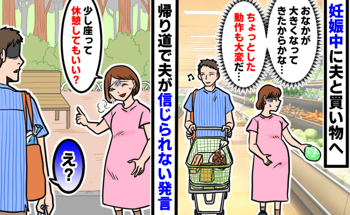 私は現在、妊娠中。おなかが大きくなってきて、ちょっとした動作も大変になってきました。そんなある日、夫と一緒に買い物へ。帰り道は夫が重たい荷物を持ってくれていたのですが、大きなおなかで歩き続けるのはしんどく、途中で「ちょっと休みたいな」と思いました。そこで夫に「少し座って休憩してもいい?」と伝えたのですが、まさかの反応をされたのです……。