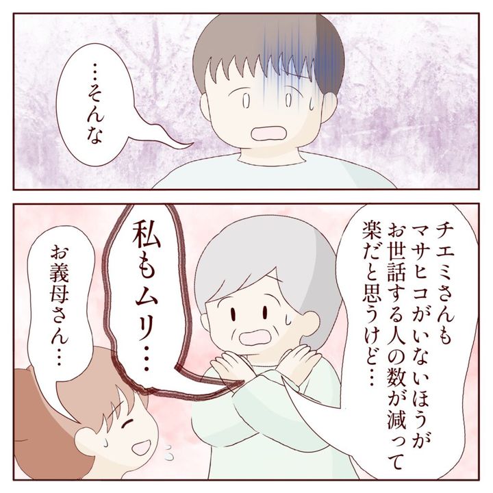 「チエミさんもマサヒコがいない方が、お世話する人の数が減って楽だと思うけど・・私もムリ・・」義母の言葉を聞いて「お義母さん・・」と呟くチエミさん。