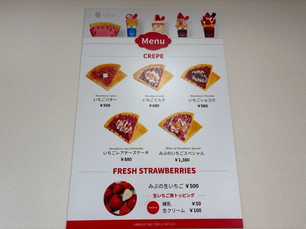 クレープに使用されているいちごは壬生町産のいちごを使用。特に「みぶのいちごスペシャル」は、生いちごが主役となっているため、5月いっぱいまでの提供が予定されています(早期終了の可能性あり)。