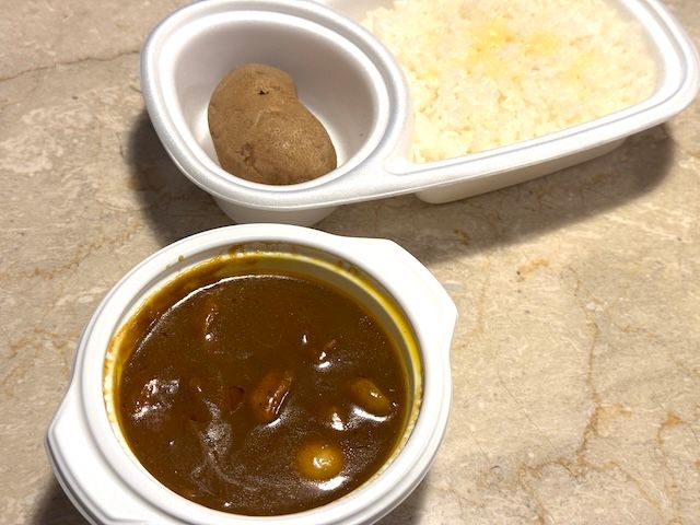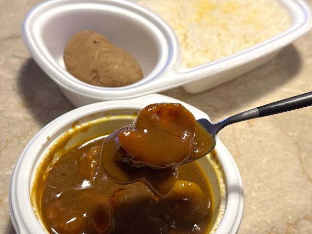 『オーベルジーヌ』の弁当に欠かせない名脇役、それが“皮付きのホクホクじゃがいも”。カレーのルーと相性抜群で、一緒に食べることで味の深みが一層際立ちます。これを目当てにするファンも多く、まさに“記憶に残る一品”として語り継がれています。筆者は付け合わせのバターをつけて、余ったルーを絡めて食べるのがお気に入りです。