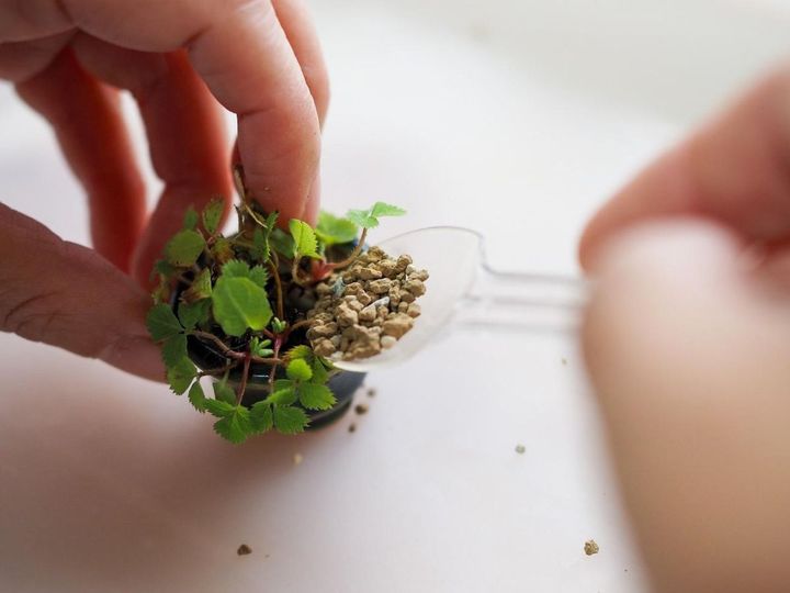庭に飛んできた植物や盆栽店などで買ってきた植物は、土を洗い、根を少し切って、極小の赤玉土や肥料を入れた鉢に入れて、さらに土をかぶせ、土が落ち着くまでは下から水を吸わせます。そして、毎日土の乾き具合をみながら、水やりを。植え替え直後は土が乾燥しがちなので、とくに注意が必要なのだそうです。