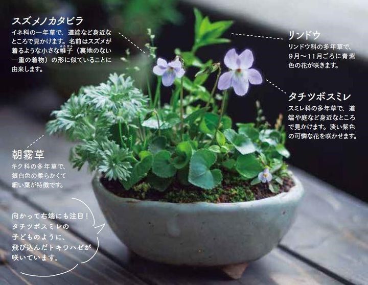 上の写真はツメレンゲという多肉質の多年草。「(植物を)小さな鉢に迎え入れた瞬間に生まれる、思いがけない表情や独特の雰囲気に心を奪われています」。お店で販売されている小さな植物や、ふだん庭の片隅や鉢植えのすみっこに、いつの間にか生えている小さな草やかわいらしい芽。豆盆栽の鉢に移し替えてみると、それぞれが主役級の愛らしさであることに気が付きます。