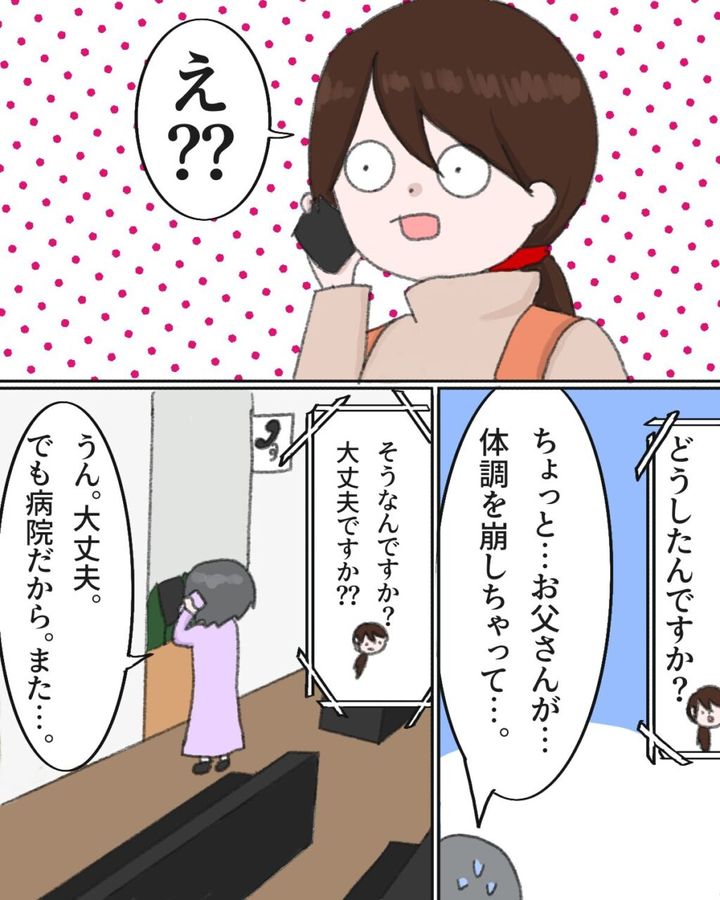 驚いて「どうしたんですか?」と聞くと、「ちょっと・・・お父さんが・・・体調を崩しちゃって。」と義母は言いにくそうに答えました。お義父さんの様態を聞くと、大丈夫だけれど、まだ病院とのことでした。お義父さん「も」!?正直、そう思いました。