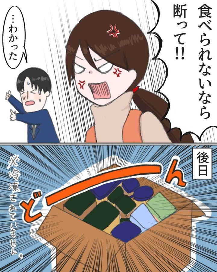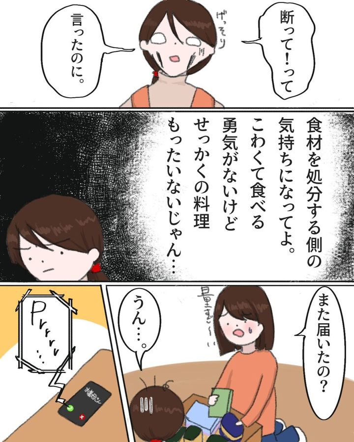 いつもは美味しい義母の料理でも、常温で送られてきたものはコワいし、実際に食べた夫は腹痛になって以来、送られてきた義母の料理を食べようとしません。義母にあまり強く言えない夫ですが、冷凍にして欲しいと言ったにもかかわらずまた義母から常温の料理が大量に届きました。