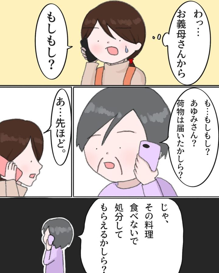 少し驚いて義母からの電話に出ると、「荷物は届いたかしら?」と確認してきました。荷物が届くとすぐにこちらから電話するのに、この日はどうしたんだろうと思いながら「あ、先ほど。」と答えると、まさかの「じゃ、その料理食べないで処分してもらえるかしら?」と言ったのです。いつもなら自信満々に「食べさせてあげて」って言うのに。