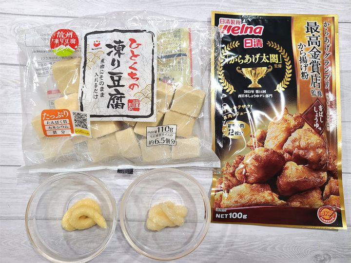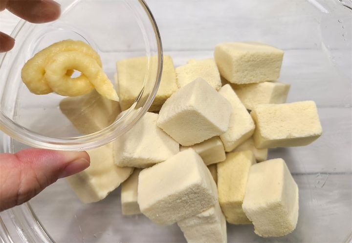 とはいえ、今回「家事ヤロウ!!!」で使用していたのは、凍った状態の「凍り豆腐」を解凍して使うというもの。筆者の住む北海道のスーパーでは、凍った状態の「凍み豆腐」を見つけることはできませんでした。そのため乾燥した状態の「凍り豆腐」を購入し、水で戻してから使用しています。