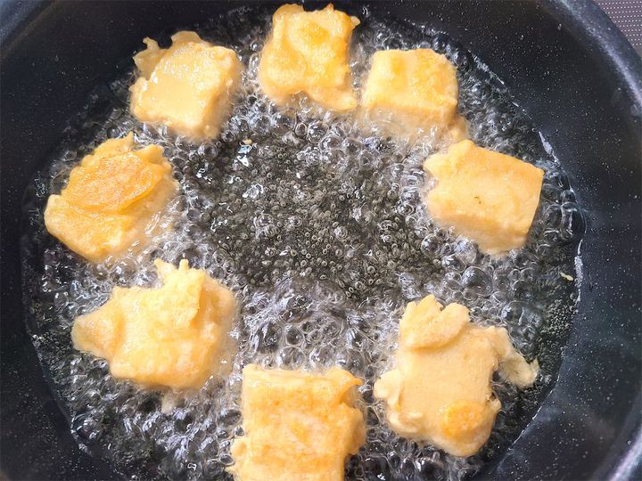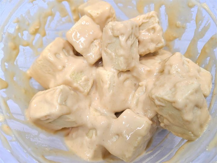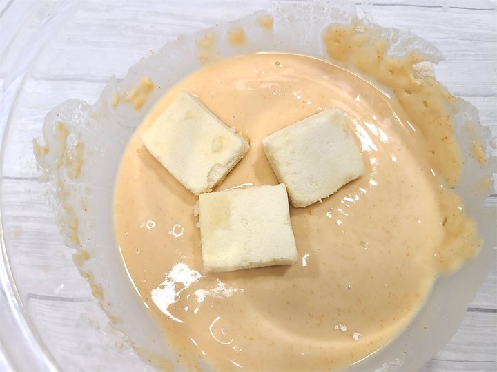 2. 唐揚げ粉をパッケージ記載の水の量で溶き、凍み豆腐に衣をつけます。