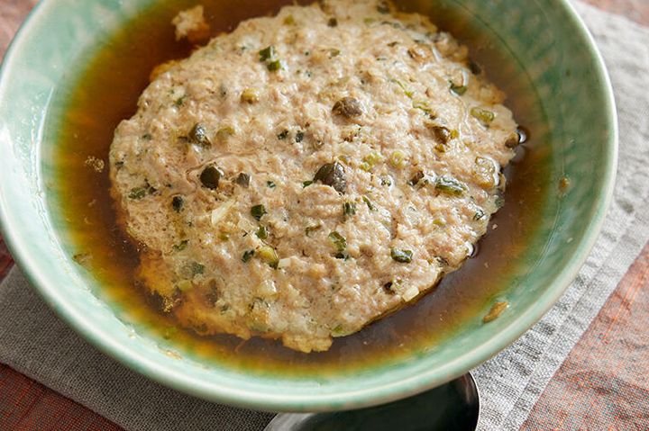 きゅうりの醤油漬けを粗みじんにしてボウルに入れ、挽き肉、下味の材料を加え、ゴムベラで押しつけるようにしながら全体をよく混ぜる。手で混ぜる場合は粘り気が出ないようにする。