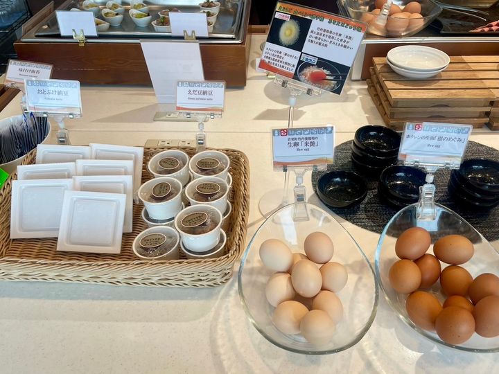 朝食ビュッフェには欠かせない『卵・納豆』は十勝の肥沃な大地と気候が育んだ特産物だからこそ複数の種類が日替わりで取り揃えられていました。