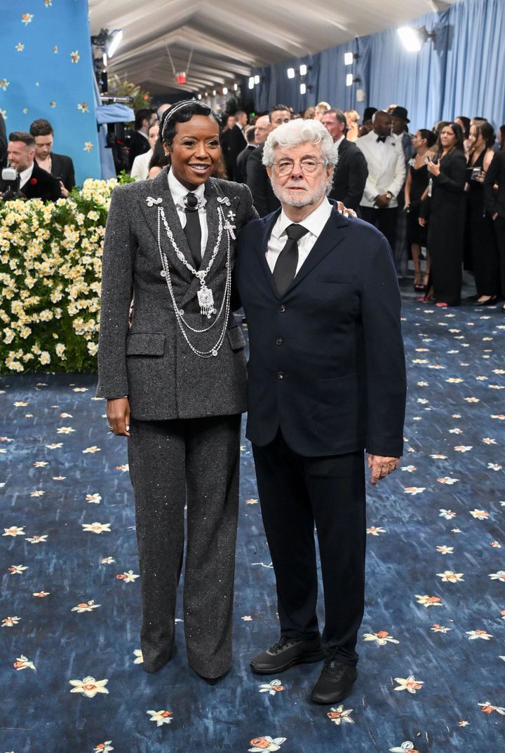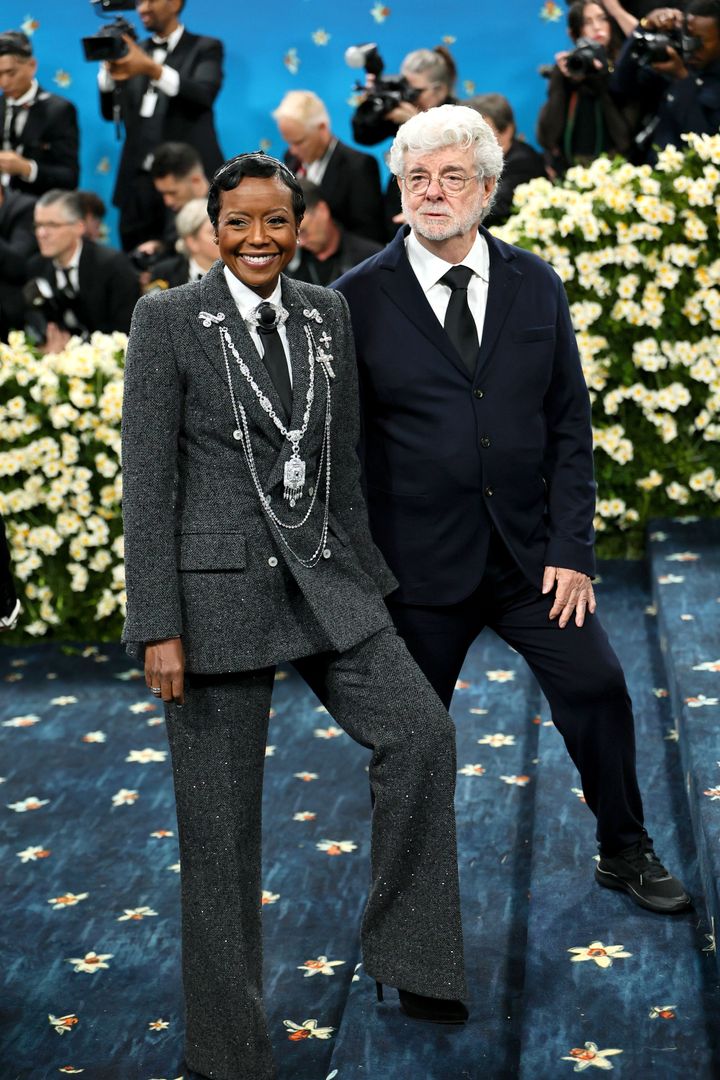 スター・ウォーズ』の生みの親であるジョージ・ルーカスは、妻のメロディ・ホブソンとともにメットガラ2025に来場。メロディ・ホブソンは、グレーのツイードスーツにブローチやチェーンを散りばめた華やかなダンディスタイルを纏っていたが、一方のルーカスは、シンプルなネイビースーツの3つボタンをすべて留め、ナイキNIKE)のブラックのスニーカーというスポットライトに当たることを好まない彼らしいシンプルな出立ちで大舞台へ現れた。