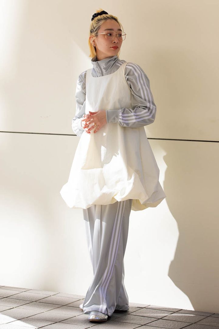 「シルバーのトラックスーツにミニバルーンドレスを重ねてシティを意識したスポーツMIXに。足元にもシルバーの軽やかなスニーカーをON。全体のトーンをまとめたのもポイント」