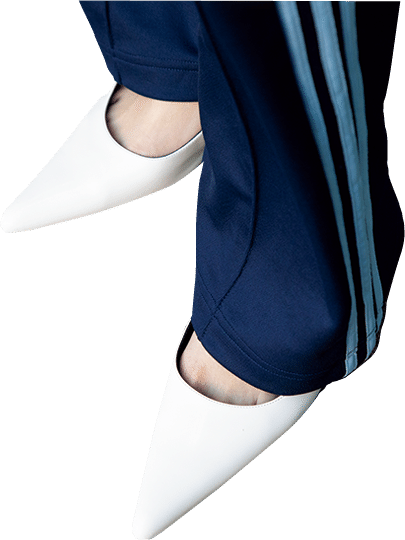 ワイドなトラックパンツの裾から覗くポインテッドトウがグッドバランス!