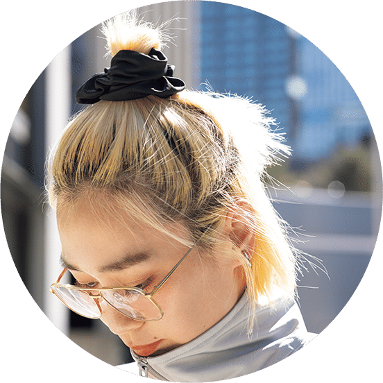 シュシュで髪をまとめて柔らかさとヌケ感をプラス。ハイトーンヘアにブラックのコントラストが◎。