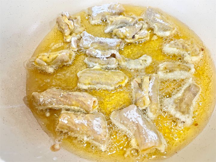 4. フライパンに揚げ油(分量外)を入れ、中火で180℃に熱する。3のモツを入れ、カリッとするまでひっくり返しながら2分ほど揚げる。