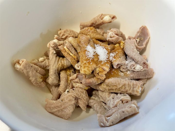 1. ボウルにモツを入れ、塩、こしょう、すりおろしたにんにくを加えて軽く混ぜる。酒、しょうゆ、砂糖を入れてしっかり揉み込み、下味をつける。