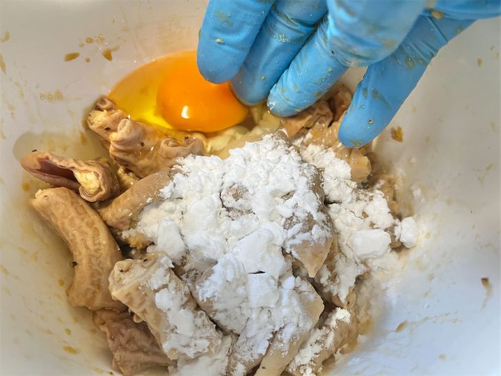 2. 1のボウルに卵と片栗粉(揉み込み用)を入れ、さらに揉み込む。