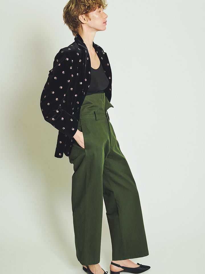 【POINT】キリッと見せる直線的な形に加え、ハイウエストでいっそう都会的に見せる算段。中には胸元の開いたキャミソールを仕込み、のぞく鎖骨で抜け感を。黒ベロアのツヤが濃厚なカーキをうるおす役割も。