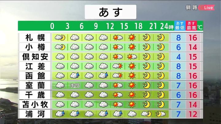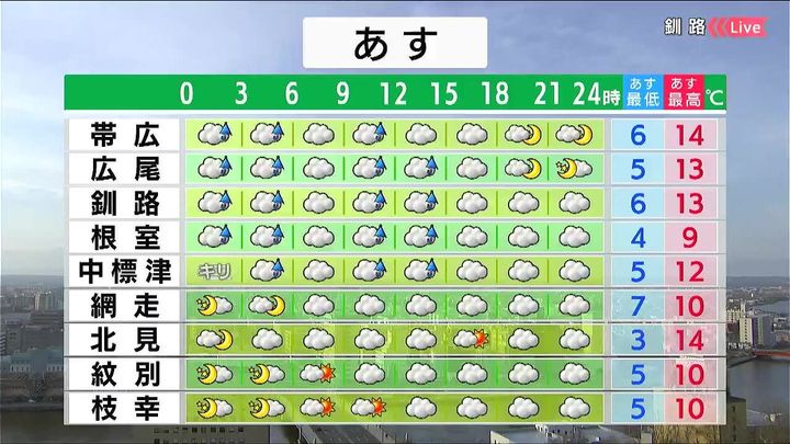 道東は雨具が必要で、昼頃まで弱い雨が降るでしょう。オホーツク海側は雲に覆われ、最高気温は海岸部できょう6日(火)より大幅に低くなります。