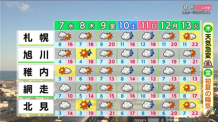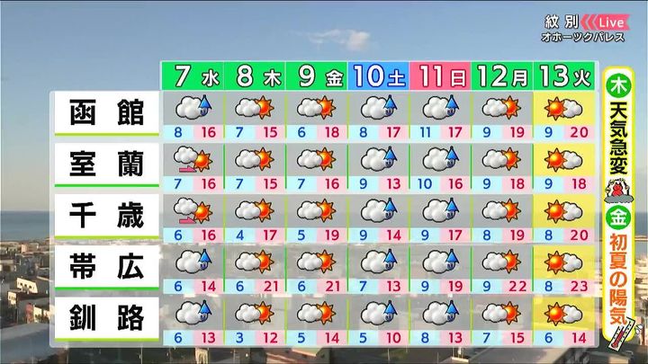木曜は山沿いでにわか雨があるでしょう。金曜は晴れて暖かくなりますが、土日は雨で、特に土曜は帯広で13度などヒンヤリしそうです。来週は晴れる日が続くでしょう。