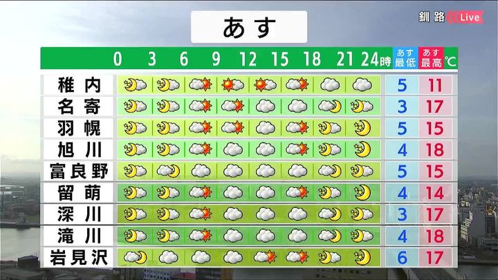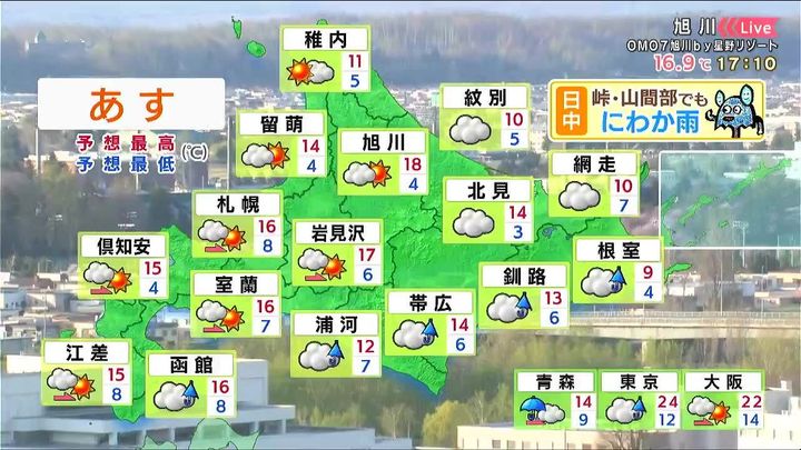 雲が広がり、太平洋側で雨が降るでしょう。峠や山沿いでもにわか雨がありそうです。最高気温はきょうより低く、紋別と網走は10度、根室は9度とヒンヤリします。