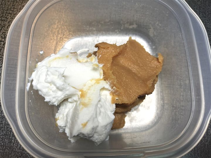 1. 保存容器にヨーグルトとみそを入れ、よく混ぜます。