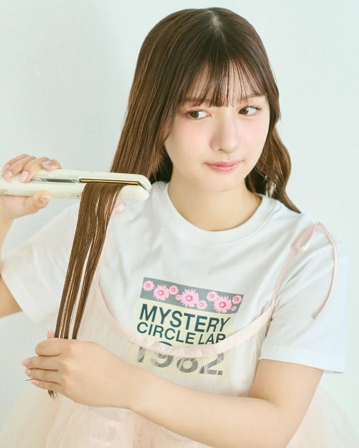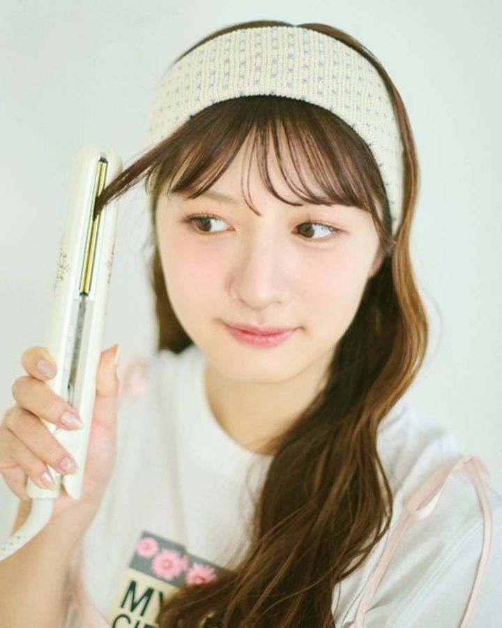 ヘアバンドをつけてから、顔まわりの髪のバランスを調整する。サイドバングは顔に張りつかないように、ストレートアイロンで軽くカーブをつける。