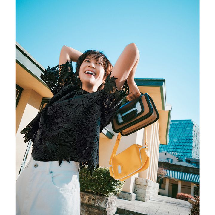 キャンディスリーブブラウス¥31,900(ル フィル/ル フィル ニュウマン新宿店)デニムパンツ¥10,450(ミラ オーウェン/ミラ オーウェン ルミネ新宿2店)イヤリング¥5,040(アビステ)ブレスレット¥11,550(エイチアッシュ/フォーティーン ショールーム)バッグ¥107,800(ルナイン/トゥモローランド)