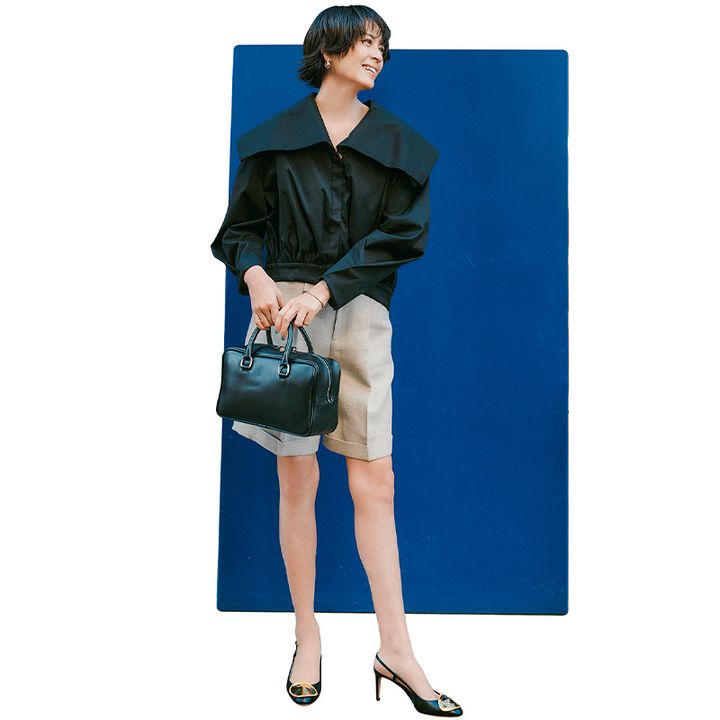 ビッグカラージャケット¥42,900(RIKO/リコ トウキョウ)ハーフパンツ¥88,000(エストネーション ザ ファースト/エストネーション グランフロント大阪店)ピアス¥74,800〈ミチ ウィルウェイ〉バングル¥6,330〈エイチアッシュ〉(ともにフォーティーン ショールーム)バッグ¥44,000(デ・プレ)パンプス¥163,900(セルジオ ロッシ/セルジオ ロッシ カスタマーサービス)