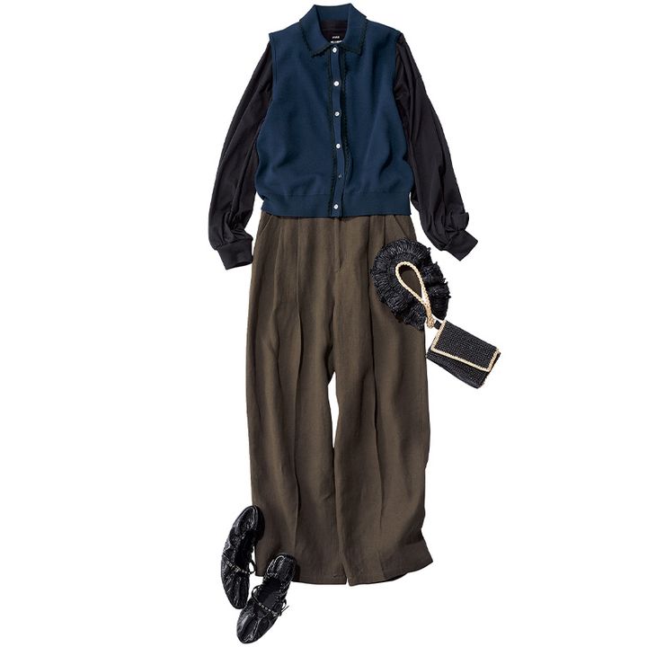 ペプラムベスト¥44,000(コルコバード/フィルム)カットソー¥11,550(スローン/ザ ショップ スローン 新静岡セノバ店)タックパンツ¥29,700(ウィム ガゼット/ウィム ガゼット 玉川高島屋S・C店)バッグ¥649,000(ヴァレクストラ/ヴァレクストラ ジャパン)靴¥173,800(セルジオ ロッシ/セルジオ ロッシ カスタマーサービス)