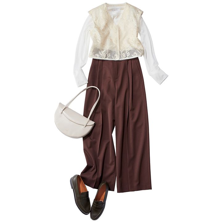 レースベスト¥39,600(コンテ/コンテ 青山店)シアーカットソー¥16,500(セピエ/コラージュ ガリャルダガランテ 新宿ミロード店)タックパンツ¥22,000(アダム エ ロペ)バッグ¥39,600(ラシット/ラシット 西銀座店)ローファー¥151,800(J.M. WESTON/J.M. WESTON 青山店)