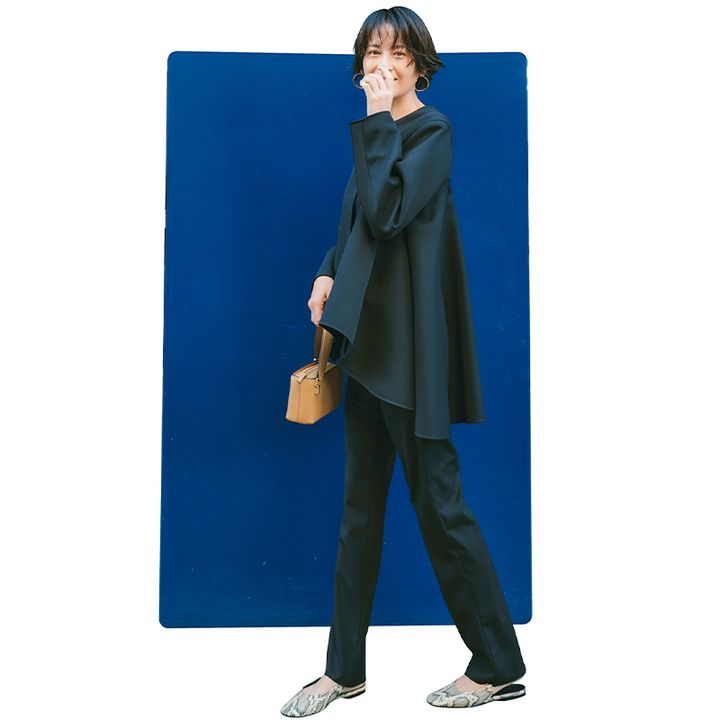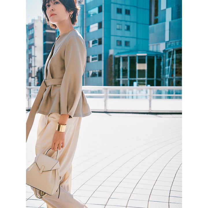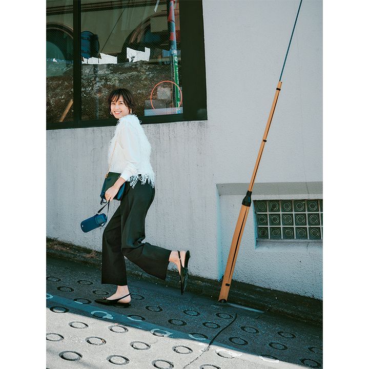 フレアジャケット¥46,200(ル フィル/ル フィル ニュウマン新宿店)パンツ¥49,500(オムガールズ/エッセンス)ピアス¥30,800(ブランイリス/ブランイリス トーキョー)バッグ¥42,900(プンティ/エルディスト ショールーム)バックストラップシューズ¥63,800(エイディ/エスケーパーズオンライン)