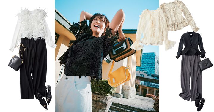 レーストップス¥66,000(デパリエ/デパリエ 伊勢丹新宿店)デニムパンツ¥35,200(アンスクリア/アマン)ピアス¥4,830(アビステ)ネックレス¥335,500(ビジュードエム/ビジュードエム六本木ヒルズ)バッグ¥187,000(ピエール アルディ/ピエール アルディ 東京)