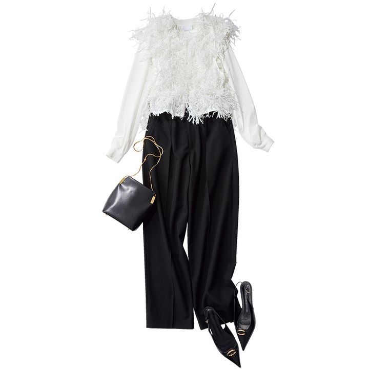 フリンジベスト¥59,400〈デ・プレ〉バックストラップシューズ¥39,600〈トニービアンコ〉(ともにデ・プレ)カットソー¥11,550(スローン/ザ ショップ スローン 新静岡セノバ店)タックパンツ¥41,800(ロエフ/エイチ ビューティー&ユース)バッグ¥69,300(マエストソ/アマン)