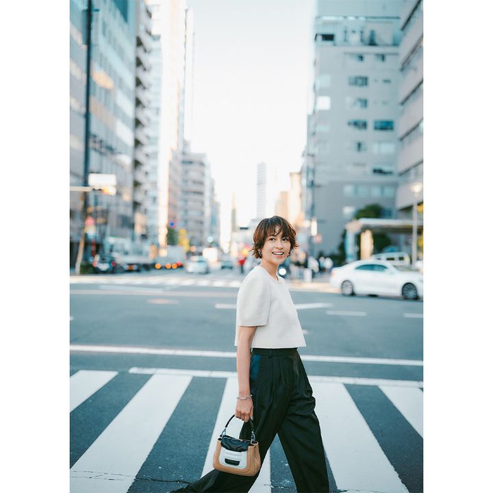 ショートジャケット¥132,000(FOXEY/FOXEY 銀座本店)タックパンツ¥66,000(フレンケン/アダム エ ロペ)ピアス¥39,600(ミチ ウィルウェイ/フォーティーン ショールーム)ブレスレット¥59,400(ブランイリス/ブランイリス トーキョー)バッグ¥178,200(ピエール アルディ/ピエール アルディ 東京)