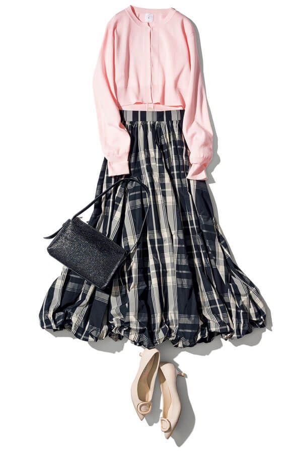 ピンク×ブラックの粋な配色でも洒落感アップ。バルーンシルエットの立体感に、大ぶりなチェック柄がドラマチックに映えるスカートは主役のインパクト。そのぶんアンサンブルは装飾控えめに、パステルタッチな色みで今年っぽさを意識すると好バランスです。