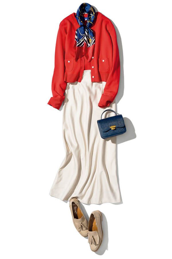 コントラストを効かせて小粋なパリジェンヌ風に。真っ赤なアンサンブルに、ネイビーが基調のシックなスカーフがくっきりと映えて素敵。クラシカルな柄にもパリっぽさが宿ります。