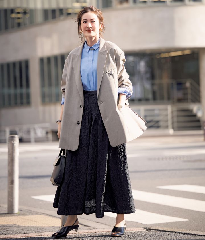少しずつペースを取り戻したい連休明けは好印象な中にも自分らしさが感じられるコーディネートで。ブルーのシャツに黒のジャカードスカートで凛とした印象に整えたらひとクセジャケットをON。等身大のオシャレで気持ちも自然と上向きに。