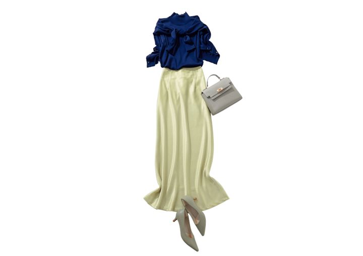 ハイネックアンサンブルニット¥18,920、サテンナロースカート¥17,600/ともにマイストラーダ ワンハンドルバッグ¥3,848/grove(ワールド) ミドルヒールパンプス¥7,700/オリエンタルトラフィック(ダブルエー)
