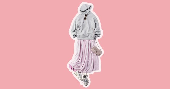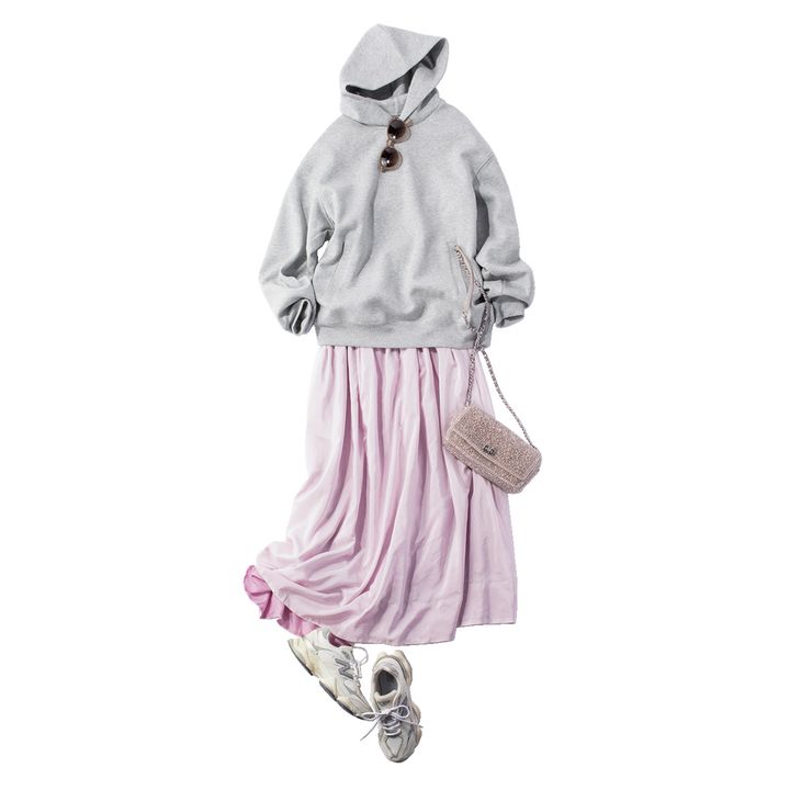 『CLASSY.』着回しDiaryから、おすすめコーデをピックアップ!女性らしいピンクのフレアスカートを、ユニクロのフーディでカジュアルダウン。スニーカーやサングラスなど小物でもスポーティ要素を取り入れれば、甘すぎない「軽やか春コーデ」に♡