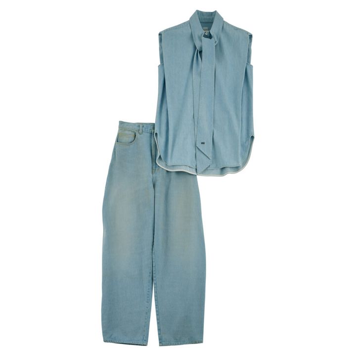 素材と仕立てを探求し、凛とした大人の姿を投影させたワードローブを展開する〈バウト〉。ダンガリーデニムのブラウスは、長めのボウタイと、肩先を覆うオーバーショルダーが特徴。高級綿であるシーアイランドコットンのデニムパンツは、高密度に織り上げながら柔らかい肌あたりを実現。カーブを描くワイドシルエットがこなれ感の鍵に。