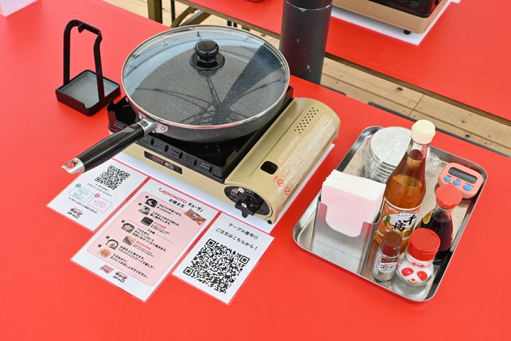 各テーブルに用意されたガスコンロとフライパンを使って、お客様ご自身で調理をして、フライパンをひっくり返すという体験ができます。(※)