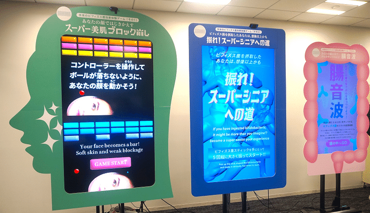 なんと、約1億通りの腸内環境ステージがあり、『ビフィズス菌!』と発声すると「ビフィズス菌爆弾」が投下!ステージごとに登場する悪玉菌のキャラクターを倒していき、最後のボスを倒すとゲームクリア。ゲームを体験しながら人それぞれ腸内環境が異なることや、ビフィズス菌について楽しみながら「健康」について学ぶことができます。