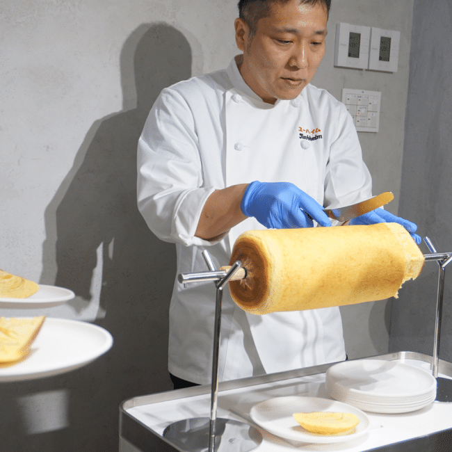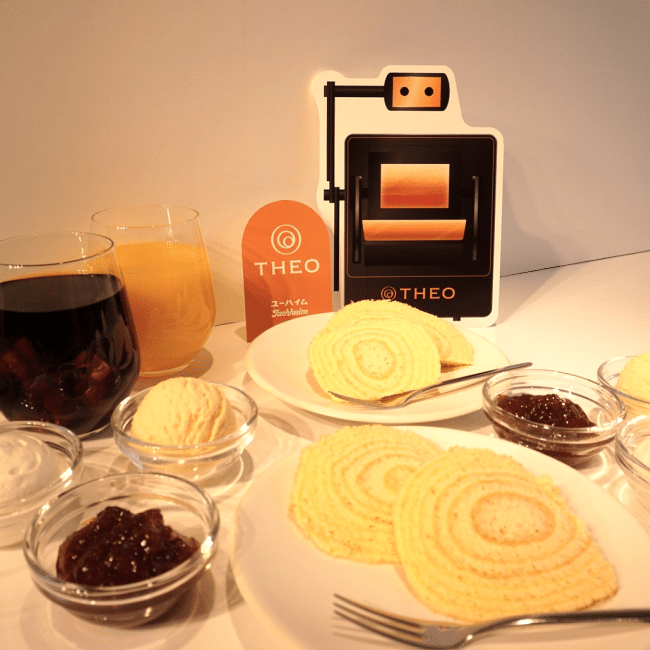 約5年の開発期間を経て誕生した世界初のバウムクーヘン専用AIオーブン「THEO」を使って焼き上げた「焼きたてバウムクーヘンの食べ放題メニュー」が提供されています。(※会期当初は店内コースのみの提供予定。)