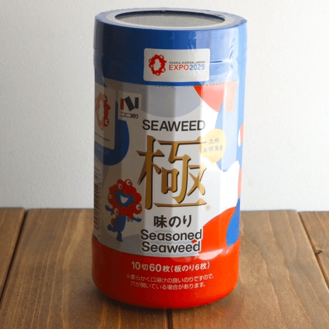 大阪・関西万博の開催を記念したミャクミャクパッケージの「味極10切60枚卓上」です。九州有明の豊穣な海で育まれた海苔を厳選し、えび・かつお・昆布・ほたての魚介4種のうま味だしで味付けしました。食べやすい10切サイズの味付のり卓上タイプだから、ごはんがどんどん進んでしまいそう。自分用にもお土産にもおすすめなので、見かけたらぜひお試しくださいね。