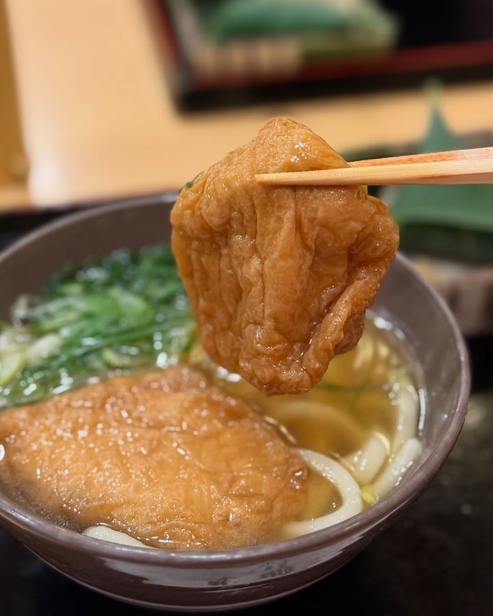 ふっくらと炊き上げた程よい甘さのお揚げと、北海道道南産の天然真昆布、九州産のサバ節やウルメ節を使ったコクと旨味のだし、そしてモチモチのうどんが見事に調和しています。