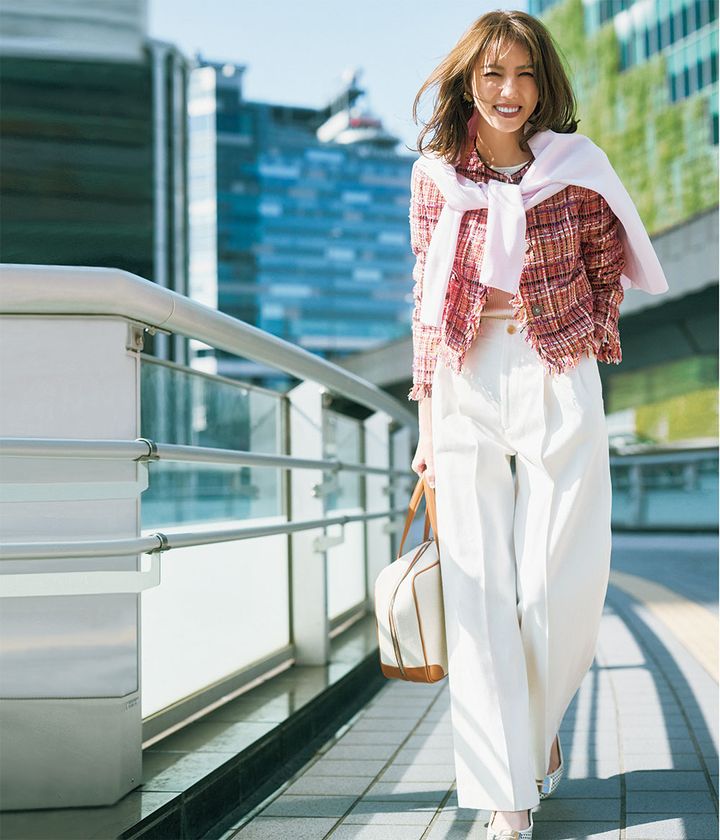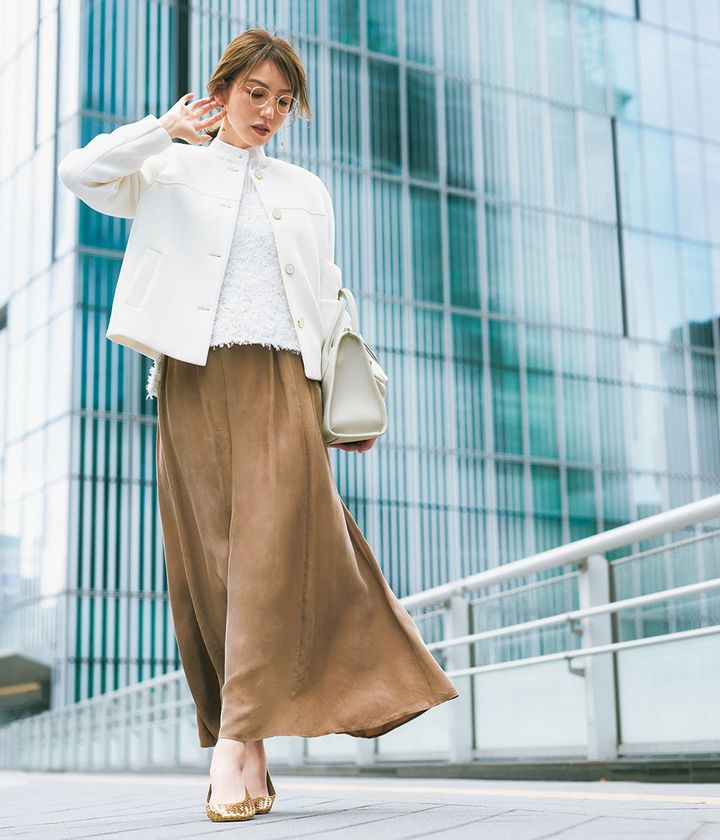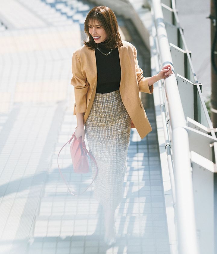 ジャケット¥39,600(スタニングルアー/スタニングルアー 新宿店)ニット¥10,780(カデュネ/カデュネ プレスルーム)スカート¥33,000(ウィム ガゼット/ウィム ガゼット 玉川髙島屋S・C店)バッグ¥42,900(トフ&ロードストーン/T&L)パンプス¥31,900(ツル バイ マリコ オイカワ)ネックレス¥46,200(ローラ ロンバルディ/八木通商)