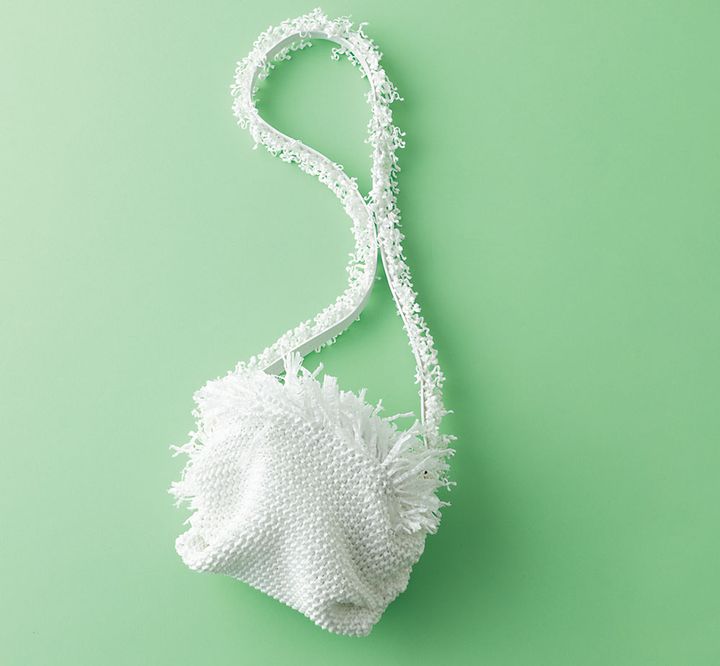 フリンジいっぱいの個性的なデザインのラフィアバッグは、遊び心満載。パステルカラーのコーデに合わせ、春のお出かけに使いたい。